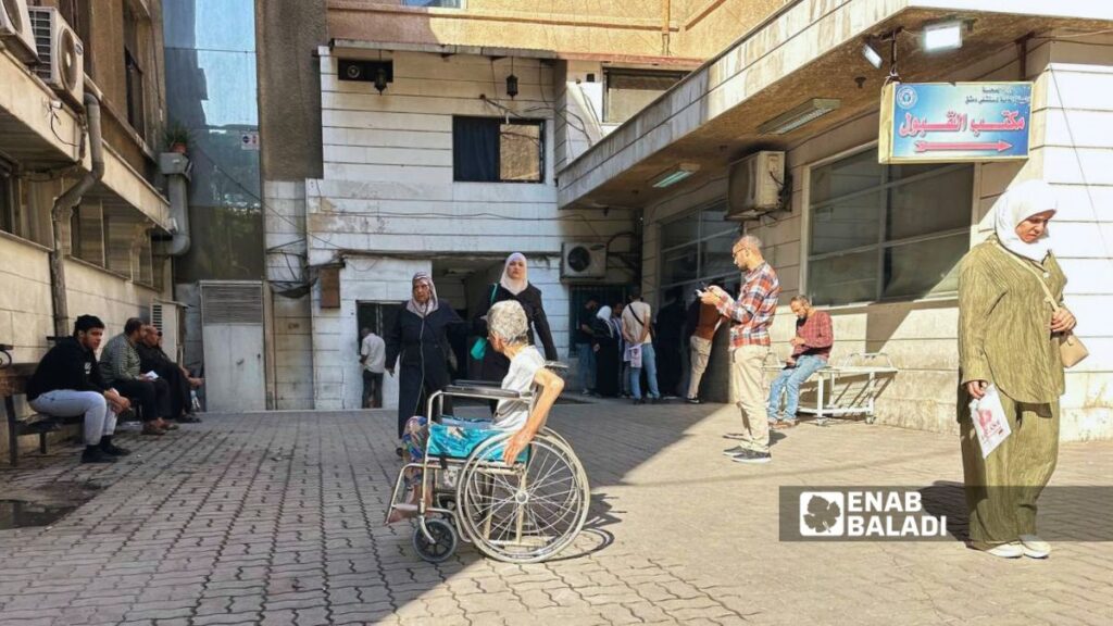 مرضى في أثناء تسجيلهم للحصول على وصل القبول في مستشفى “المجتهد” بدمشق – 13 تشرين الأول 2025 (عنب بلدي/ أحمد الحمود)