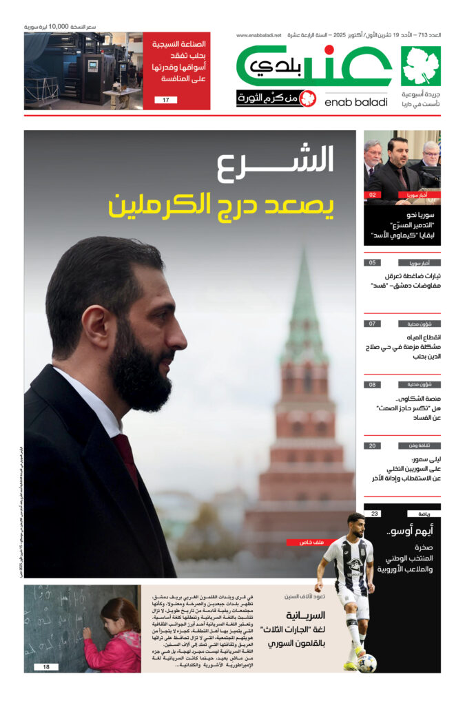 الرئيسية > أعداد الجريدة عنب بلدي – العدد 713 – الأحد 19 تشرين الأول 2025 2025/10/19 11:59 ص أعداد الجريدة, الجريدة المطبوعة enab_get_authors_shortcode مقالات متعلقةعنب بلدي – العدد 607 – الأحد 8 تشرين الأول 2023عفرين.. مقتل جنديين تركيين بقصف لـ"قسد" أردوغان يعلن التجهيز للسيطرة على أربع مناطق سوريةالمعارضة ترفع الجاهزية في الشمال السوري: تحرك على بعض الجبهات أعداد الجريدة عنب بلدي – العدد 712 – الأحد 12 تشرين الأول 2025 عنب بلدي – العدد 711 – الأحد 5 تشرين الأول 2025 عنب بلدي – العدد 710 – الأحد 28 أيلول 2025 المزيد من أعداد الجريدة