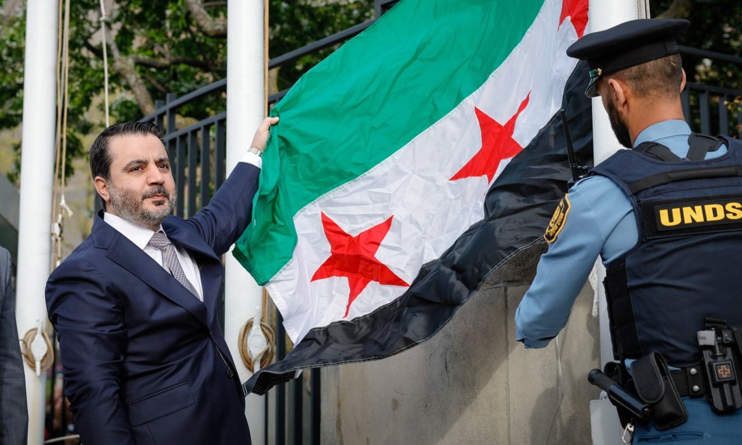 وزير الخارجية السوري أسعد الشيباني، يرفع علم سوريا الجديد في الأمم المتحدة 25 من نيسان 2025 (أسعد حسن الشيباني / إكس)