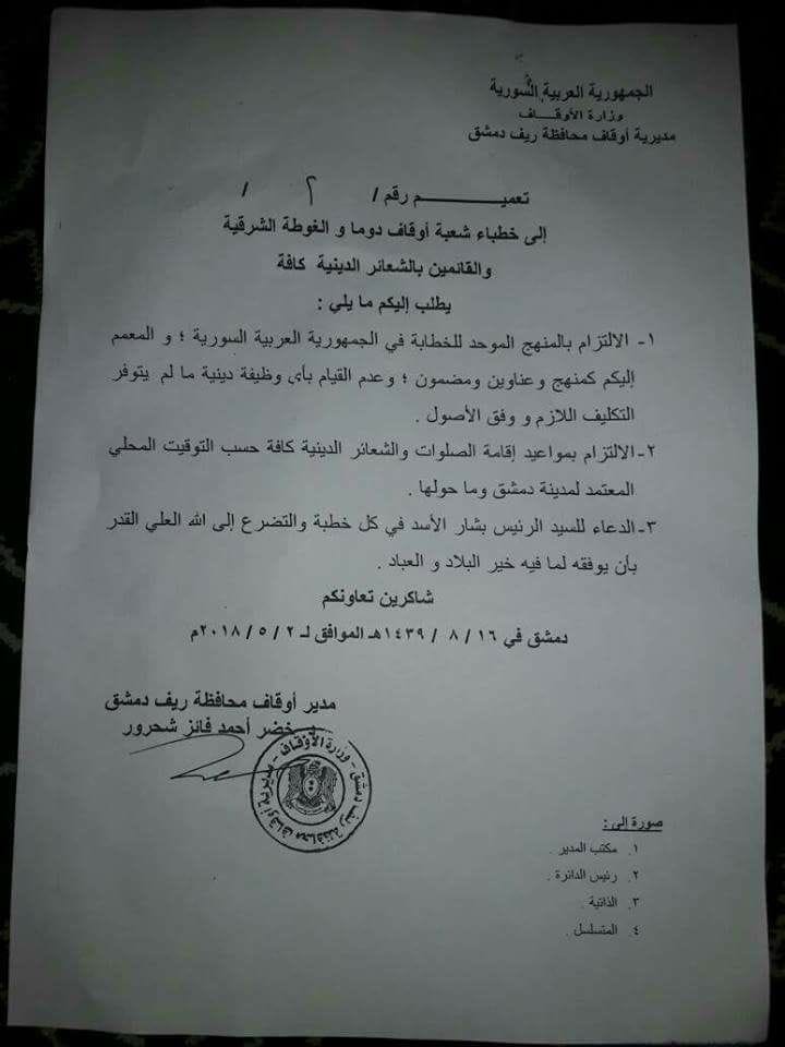 وبحسب تعميم صادر عن مدير أوقاف ريف دمشق، خضر شحرور، بتاريخ، الأربعاء 2 من أيار، طلب من أئمة المساجد والخطباء والقائمين بالشعائر الدينية الدعاء للأسد.