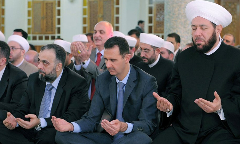 بشار الأسد ومفتي سوريا احمد حسون ووزير الأوقاف عبد الستار السيد في صلاة العيد- 2016 (سانا)
